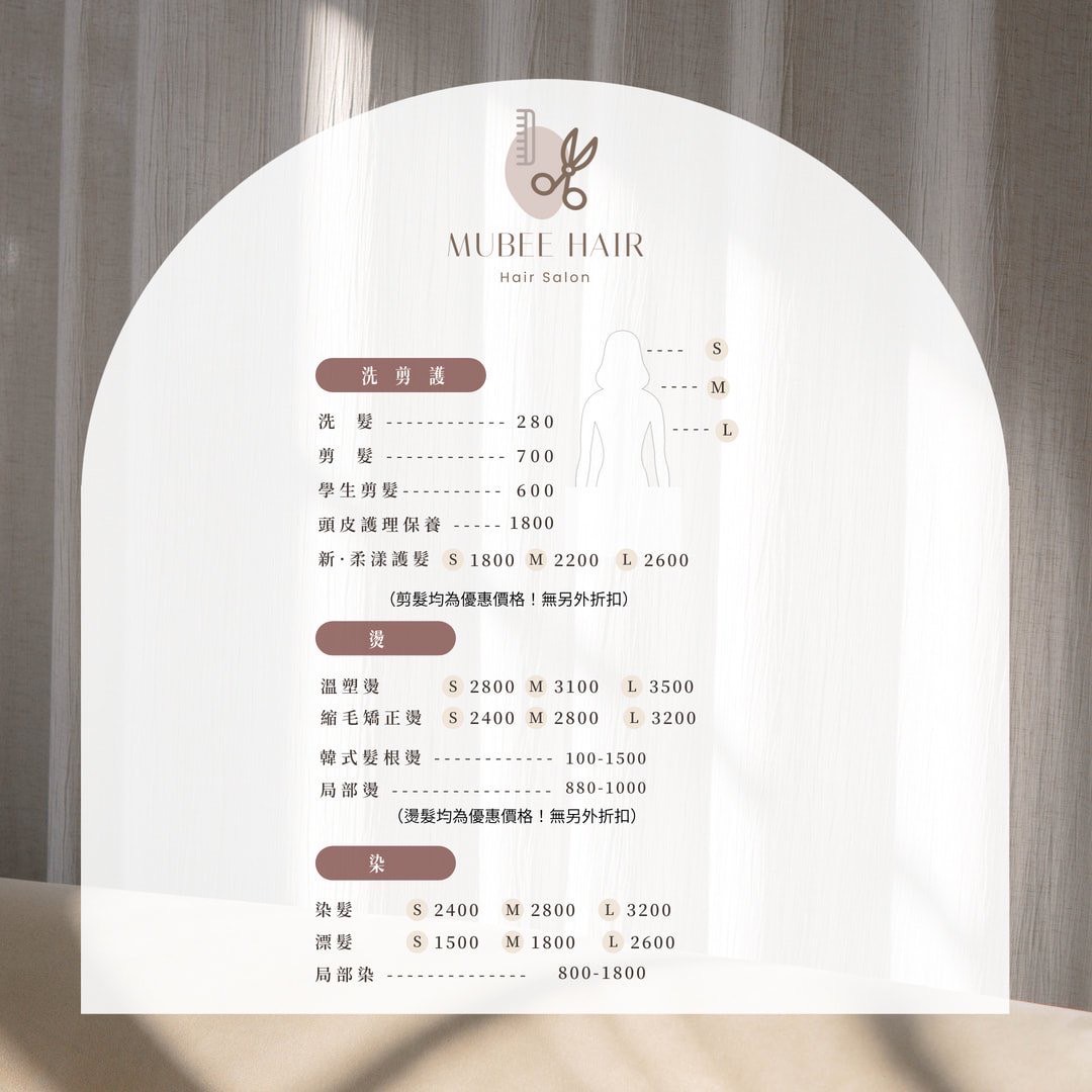 Mubee hair salon 提供各式服務項目。我們的宗旨是為顧客提供優質的服務,並致力於滿足顧客需求。我們會根據每位顧客的需求,提供量身定制的服務,並不斷更新最新的技術來滿足市場需求。 在這裡,您可以享受專業、友善、舒適的服務,我們都會為您提供個性化的體驗。期待您的光臨!